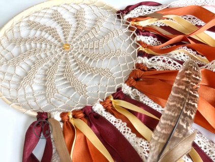 Velký designový lapač snů na zeď pro Váš klidný spánek a dekoraci Vašeho domova. Ruční práce, dřevěný kruh, háčkovaná krajka, české stuhy, sluneční kámen